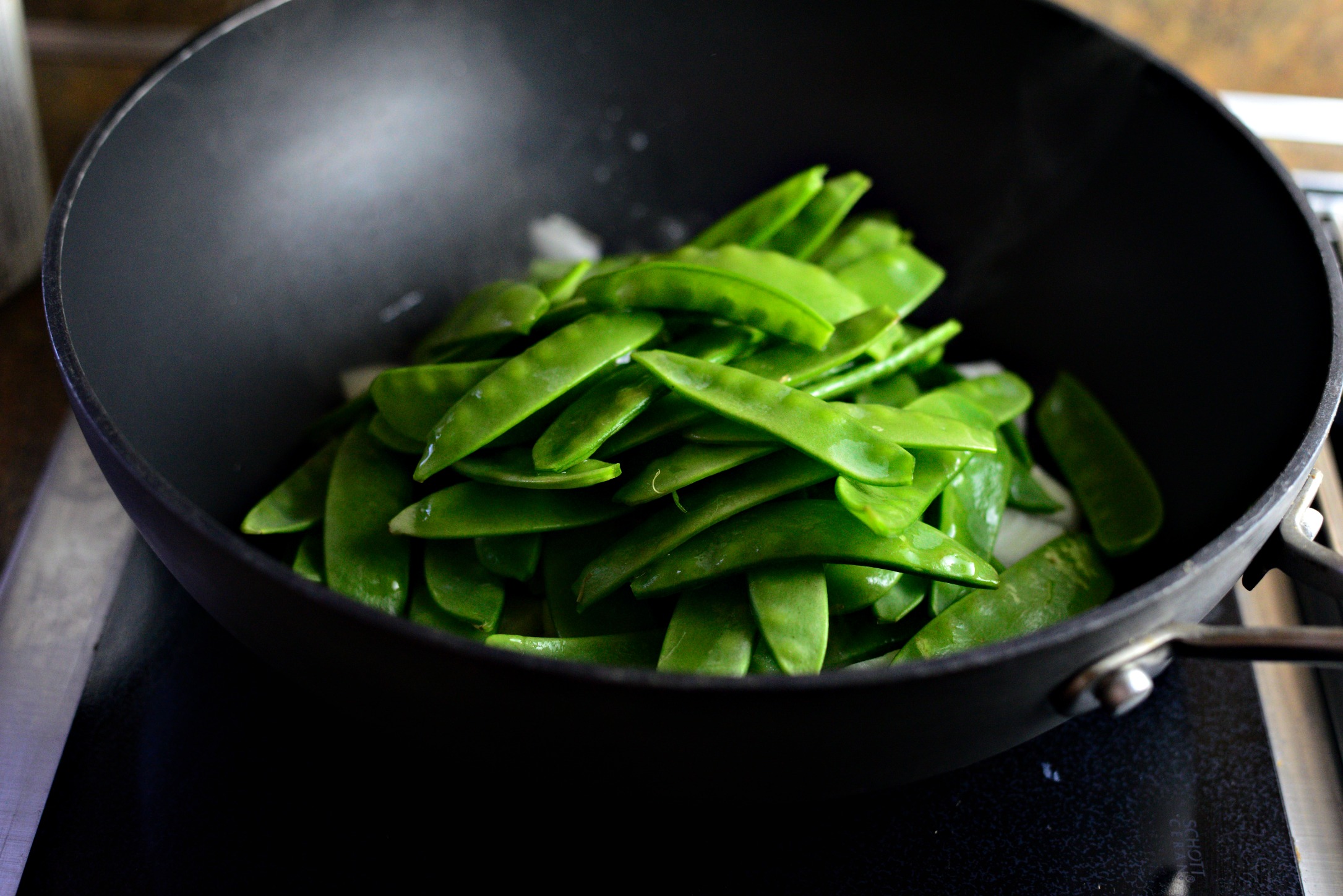 - Preheat wok to medium-high to high heat. Add in 1 teaspoon of oil and add onions and pea pods. Cook until onions have softened and the pea pods turn a bright green. About 4 minutes. Transfer to a clean bowl.