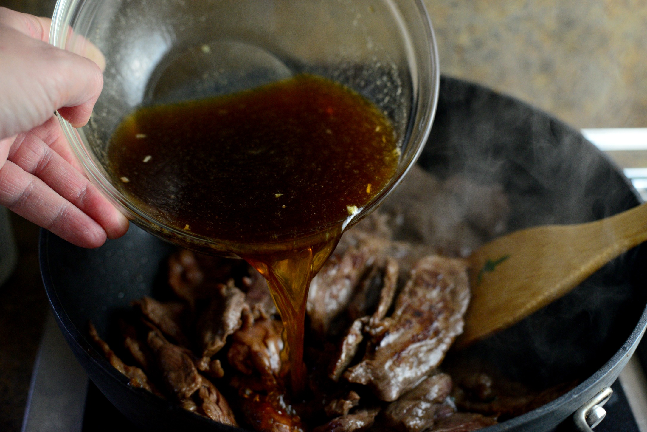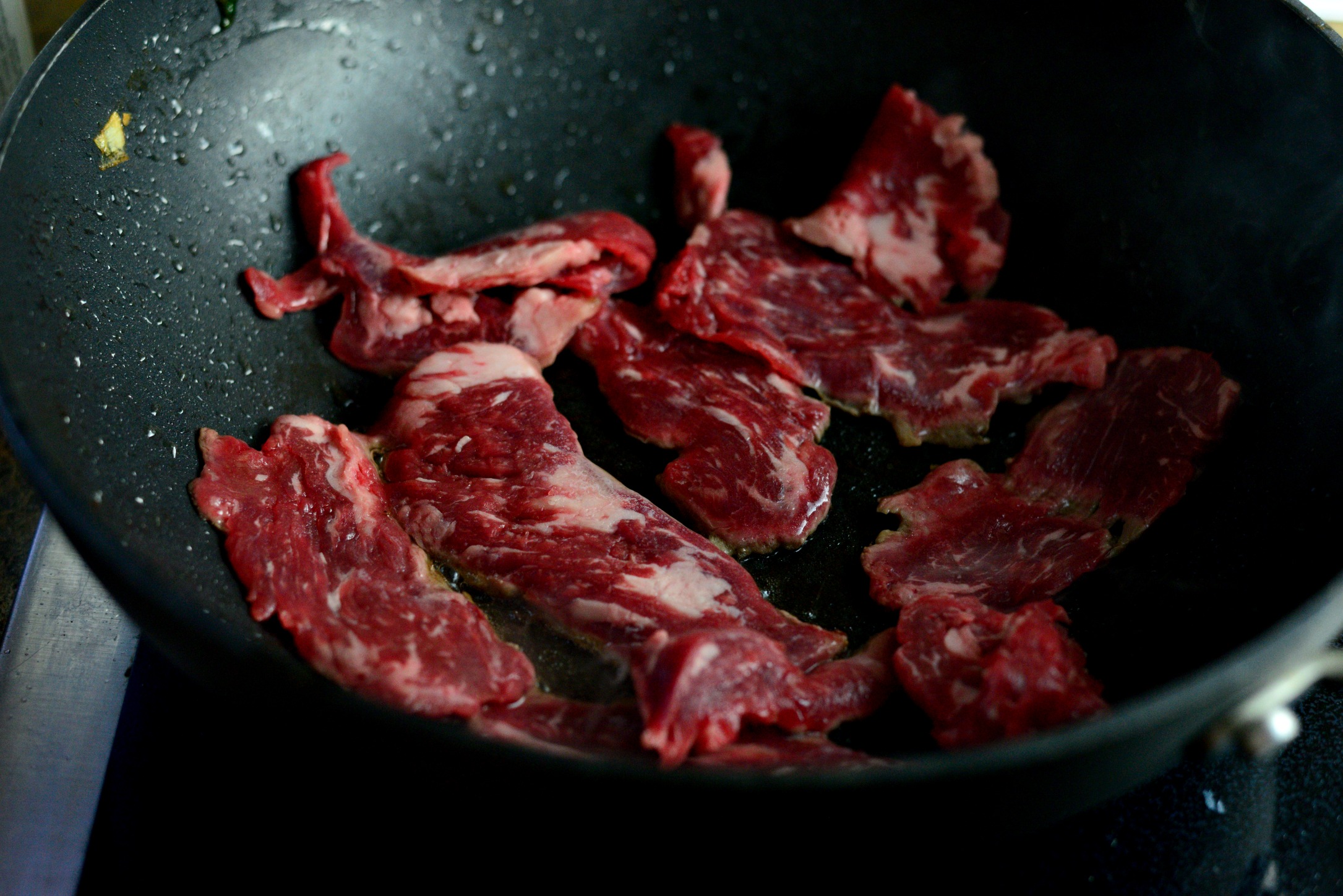 - Heat 1 tablespoon of oil in wok and work in batches searing the steak on both sides. The steak should still be a little pink before transferring to a platter. Once you are on the second side of the last batch of steak, add the rest of the partially cook steak into the wok.