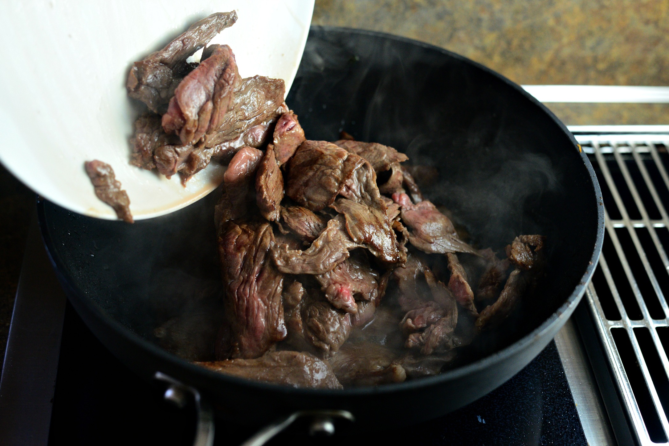 Add in the partially cooked steak…