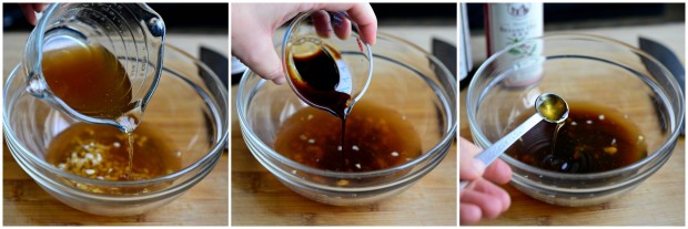 Next, add it into a bowl along with 1 cup beef broth, 3 tablespoons low-sodium tamari (or soy sauce if that’s what you primarily use) and 1/2 teaspoon toasted sesame oil.