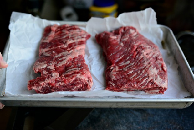 I had skirt steak on hand, but a good size ribeye would also work here as well. Truthfully my husband prefers the ribeye, I on the other hand am less picky (if you can even believe it) and like both. If using flank steak I’ll cut the long slab of beef in half width-wise and place it onto a small parchment paper lined sheet pan before popping it into the freezer for 20-25 minutes.