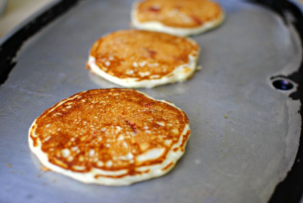 Cook the pancakes 3 to 4 minute or until the underneath is golden brown and the tops are just about set. The strawberry buttermilk pancakes should only need a few more minutes on the second side.