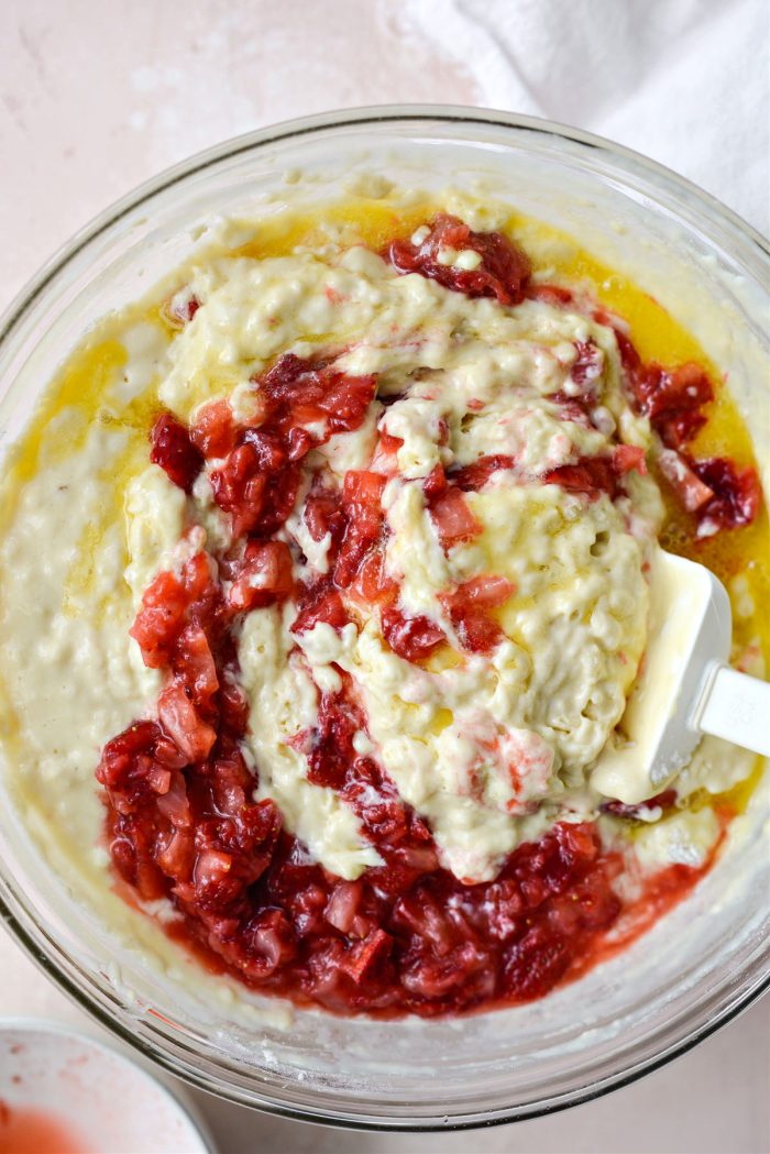 - Pour the wet ingredients into the dry, and gently stir to until just about combined. Lastly, add in the melted butter and mashed fresh strawberries and stir until evenly distributed.