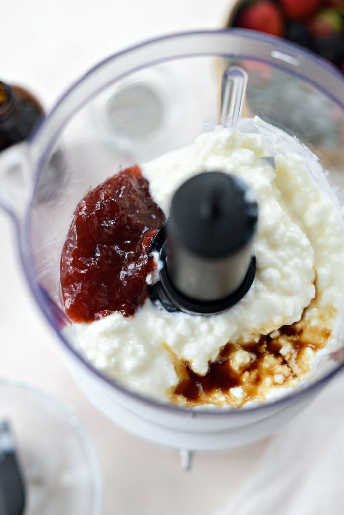 In the bowl of your mini food processor, add 8 ounces cottage cheese, 2 tablespoons strawberry jam and a splash of vanilla extract.