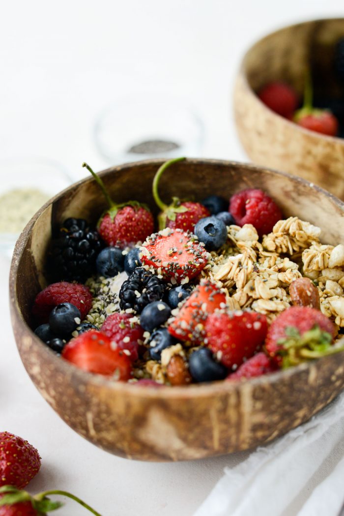 Lastly, add fresh berries, chia and hemp seeds (if desired).