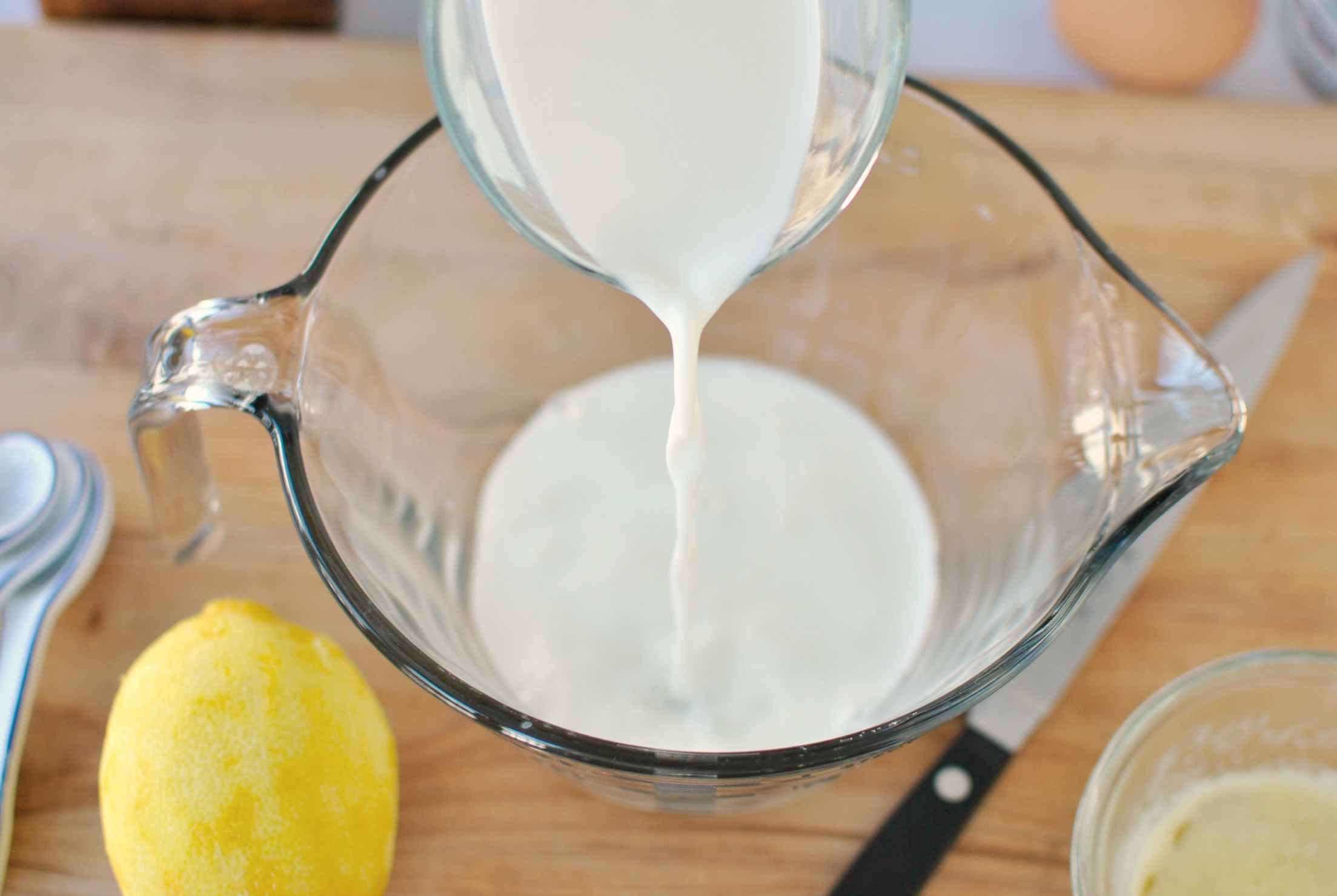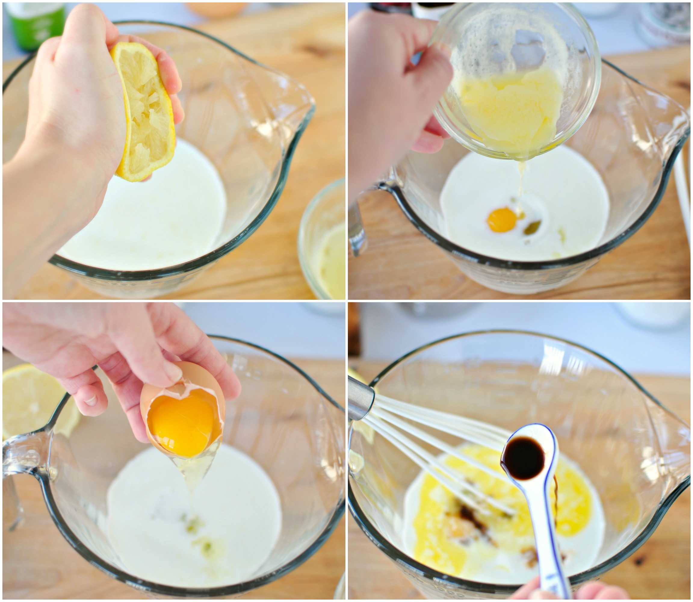 - In another bowl combine the 2/3 cup of whole milk, one whole egg, a teaspoon of fresh lemon juice, two tablespoons of melted butter (that has cooled) and half a teaspoon of vanilla extract. Whisk to combine and add it into the dry.