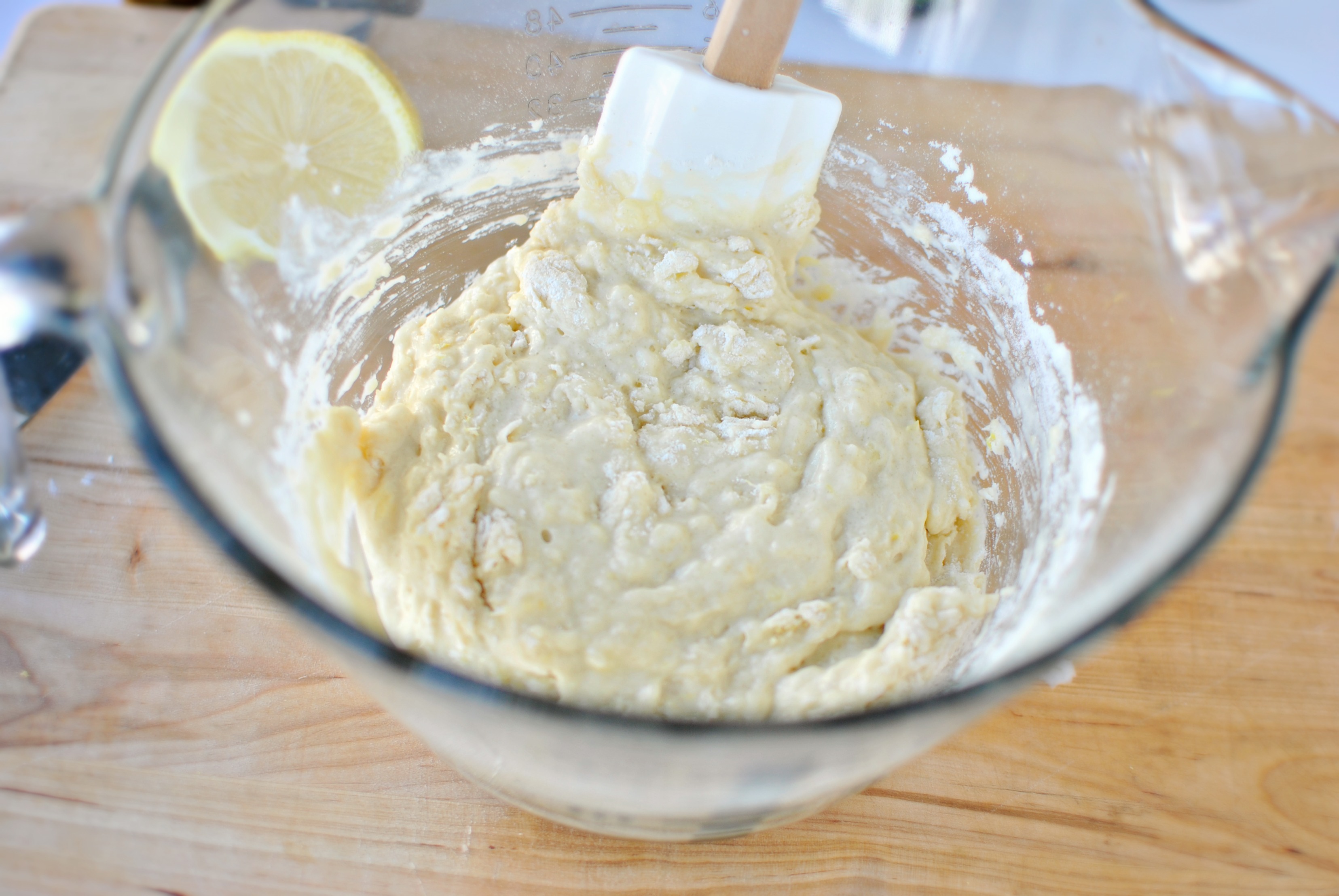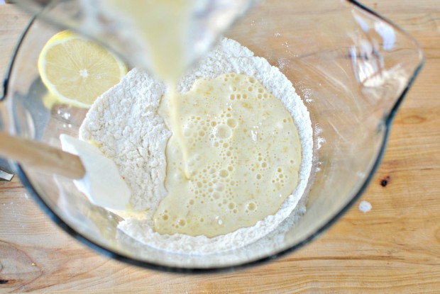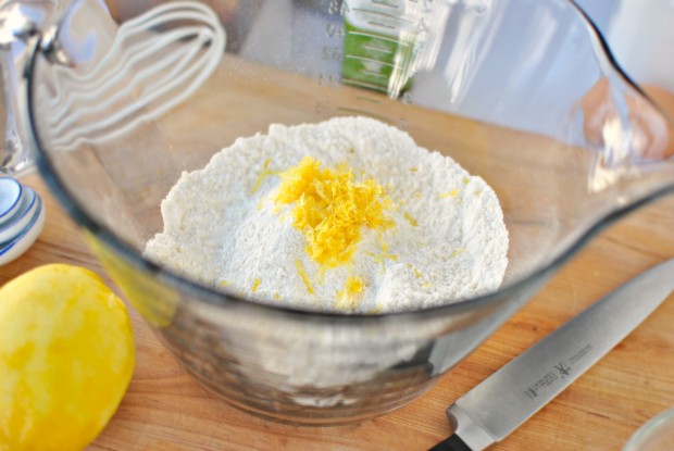 - In a medium bowl combine the cup of flour, 2 tablespoons of sugar, a teaspoon of baking powder, a half teaspoon of baking soda and a quarter teaspoon of kosher salt. Grate in the zest from a whole lemon and whisk to combine.