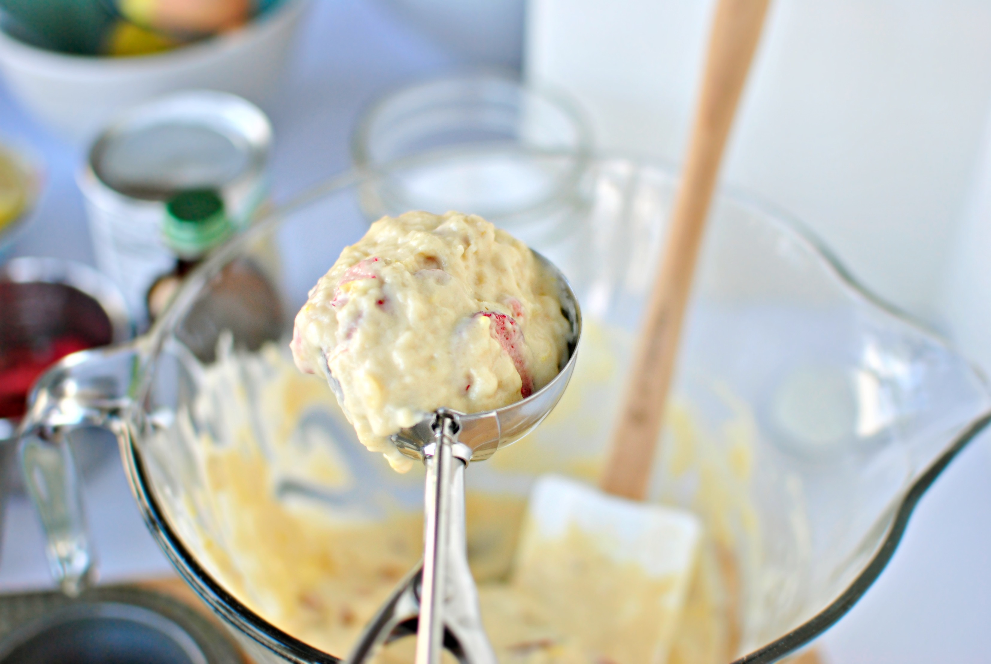 - With a rubber spatula mix the ingredients together, scraping the bottom of the bowl. Add in the strawberries and mix until combined.