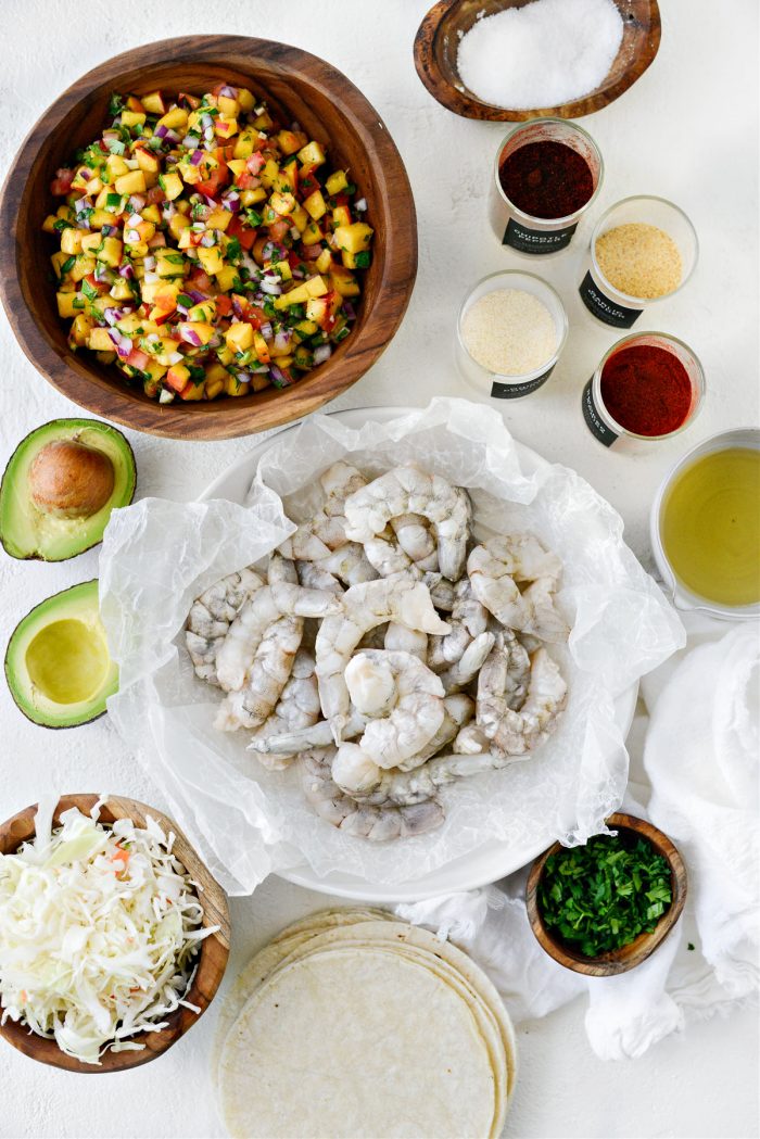 Fill the corn shells with some of the shredded cabbage and cooked shrimp, top with sliced avocado and a couple spoonfuls of the fresh peach salsa.
