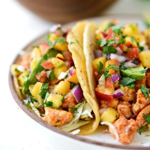 I’m not complaining because in Michigan, you never know what kind of summer weather you will get. But with these high summer temps comes the lack of wanting to stand over something hot and cook. And this quick and easy shrimp taco with peach salsa recipe is the perfect light and healthy meal.