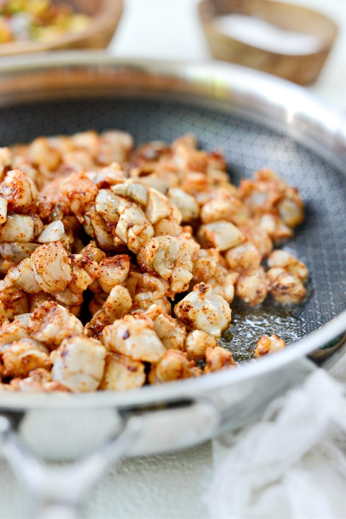 - When the oil is hot and shimmering, carefully add in the seasoned shrimp.