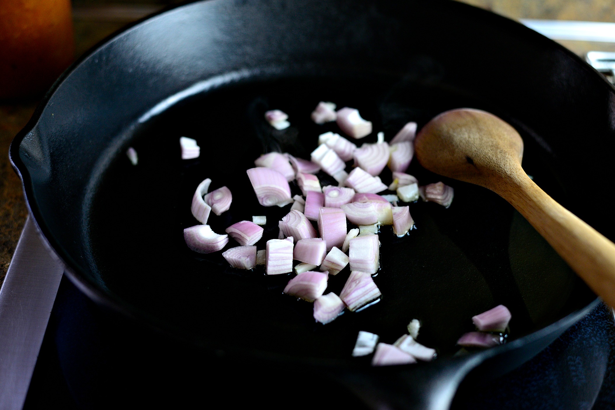 Heat a large 12 inch skillet over medium heat, add a tablespoon of olive oil and once hot, throw in the diced shallots.