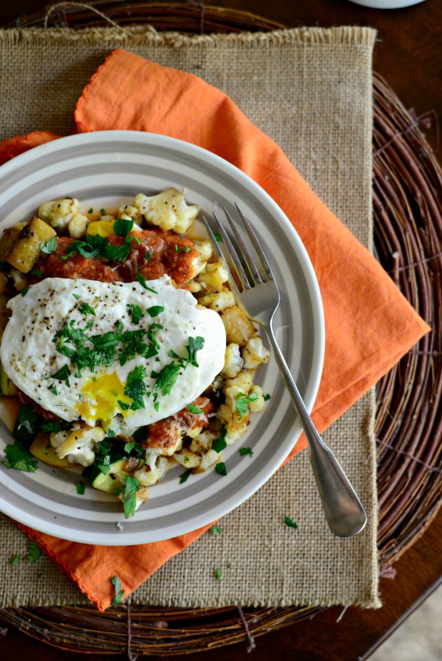 This breakfast skillet hash is my newest and latest favorite breakfast. I had a jar left of my homemade enchilada sauce {but you could SO go the marinara route} which gave this dish some kick. It’s simple, fresh and slap a fried egg on top and that drippy egg yolk… ohmegoodness.