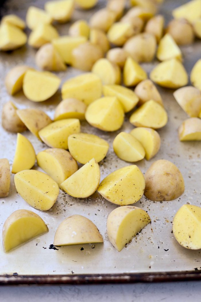 - Quarter the potatoes and toss with the olive oil, salt and pepper on the pan.
