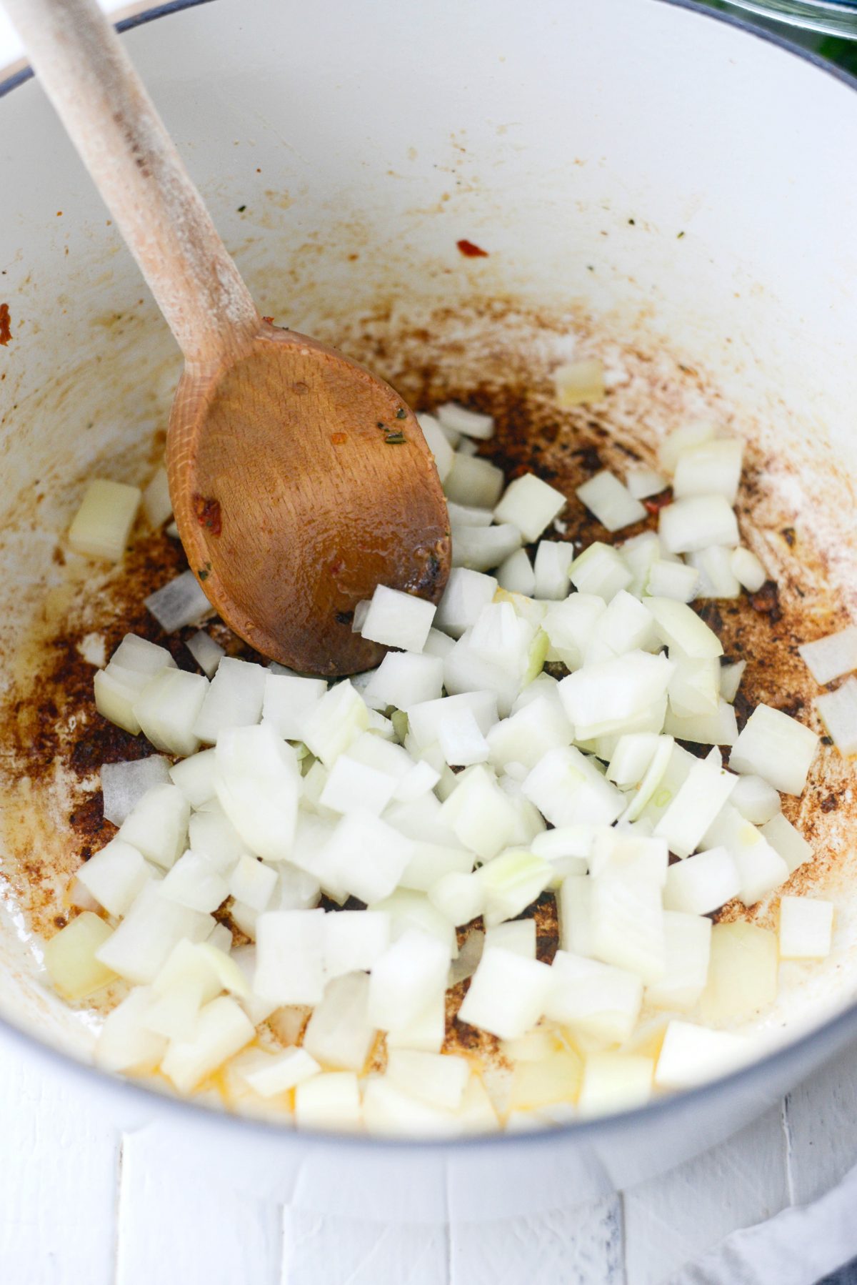 Reduce the heat to medium and add in a teaspoon of olive oil. Then add in the diced onions and a pinch of kosher salt. Stir and cook for 5 to 8 minutes or until soft and translucent.