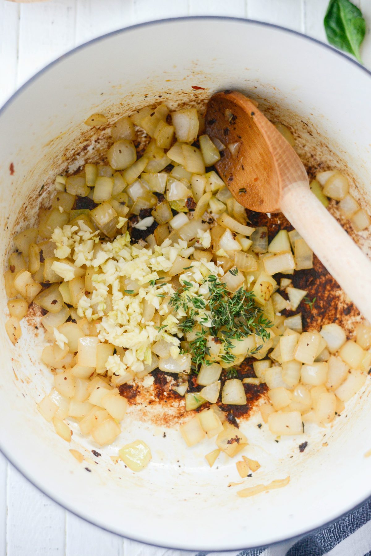 - Reduce the heat to medium and add a teaspoon of olive oil. Next add in the onion with a pinch of salt. Stir and cook until the onions are soft and translucent. About 8 minutes. Next add in the minced garlic and the thyme. Cook for 1 to 2 more minutes.