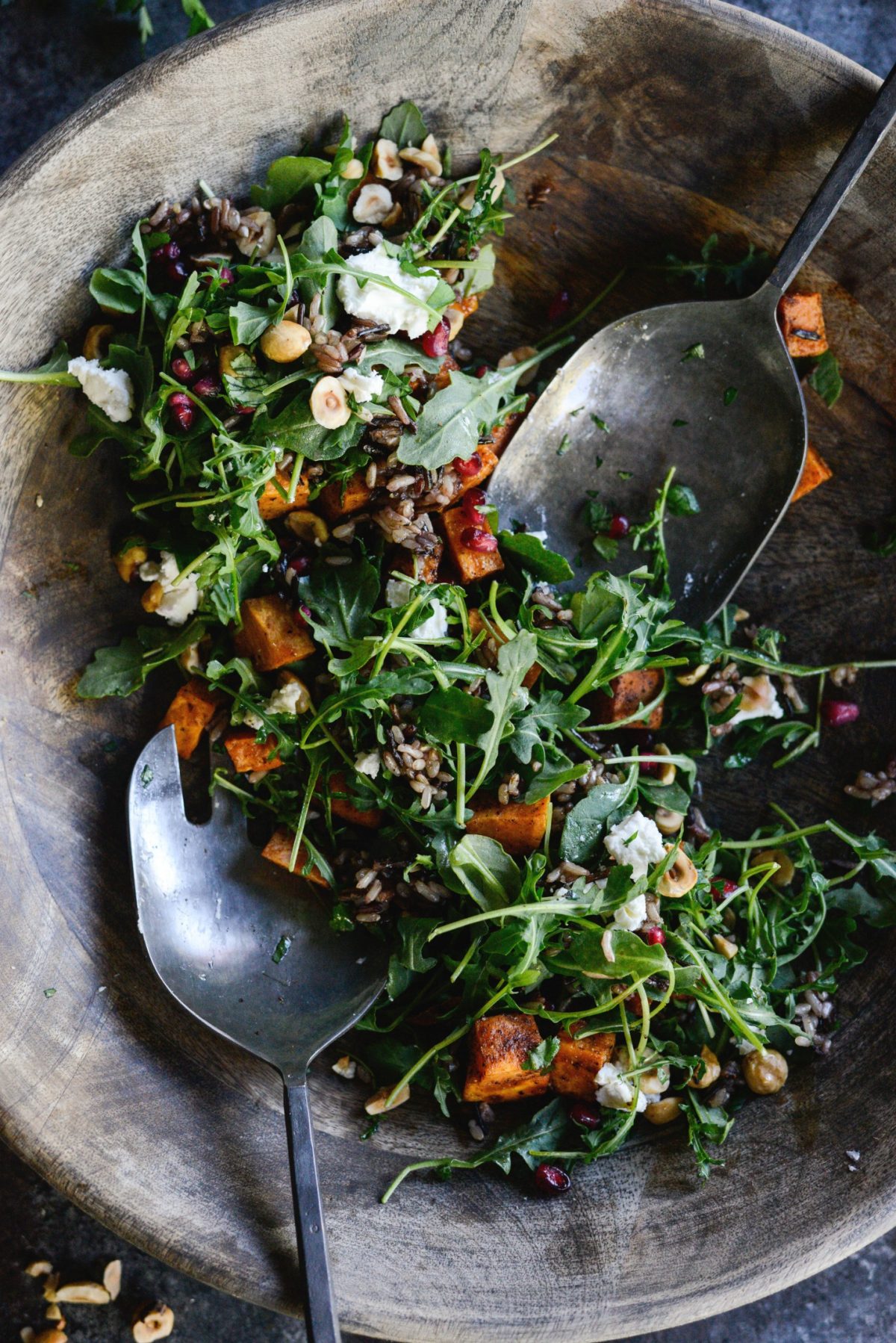 I lost my mind over this sweet potato wild rice arugula salad. So many flavors that are utterly scrumptious; goat cheese, sweet potatoes and hazelnuts with the peppery arugula, tart pom seeds and hearty wild rice is everything.