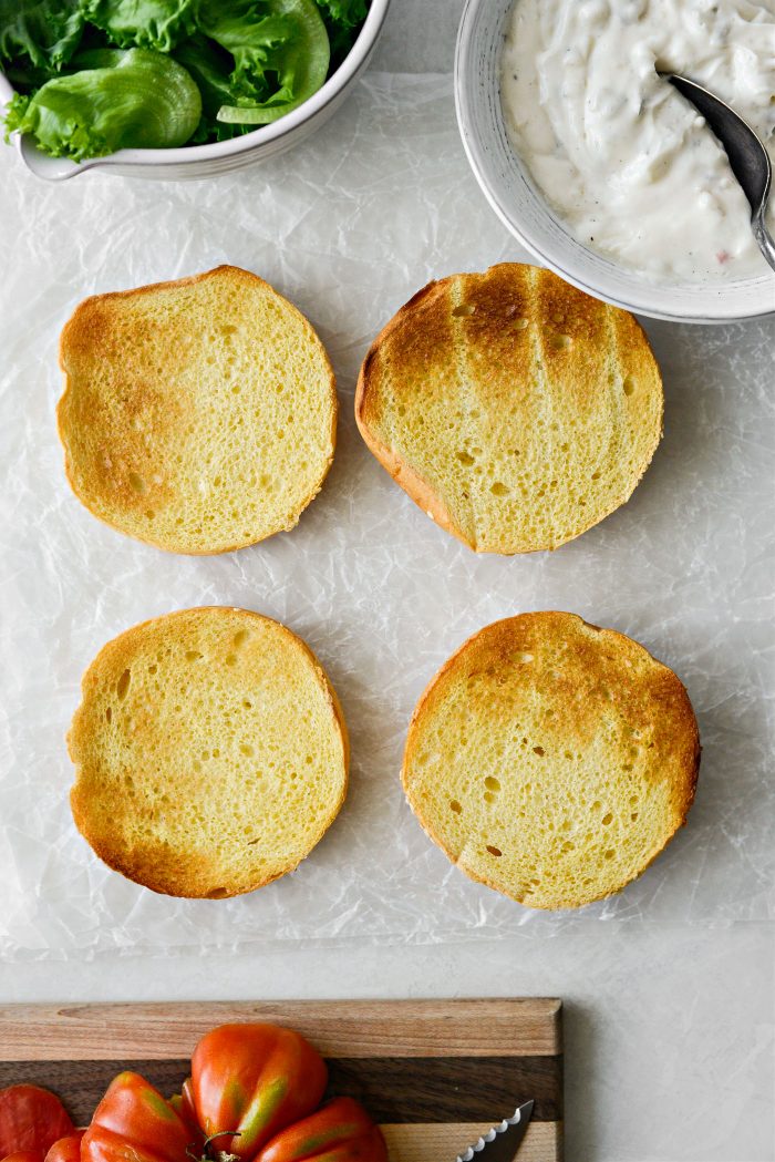 - Toast your sandwich buns and spread both the inside of the top and bottom bun with homemade tartar sauce.