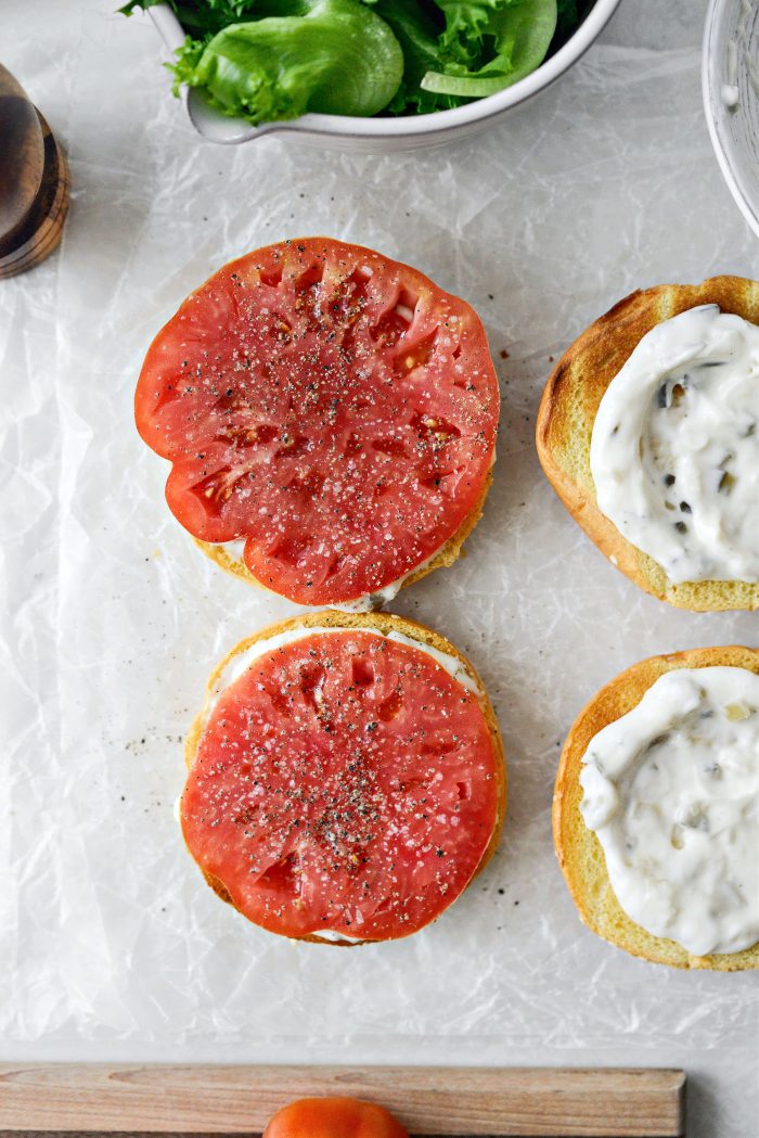 - Top the bottom half with a slice of tomato (if desired) and season with a salt and pepper.