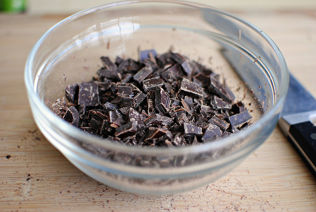 Finely chop 8 ounces dark chocolate. Try to keep them in small uniform pieces so they melt evenly.
