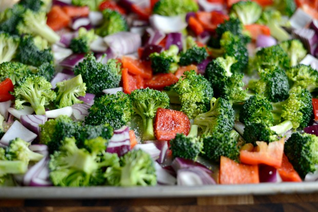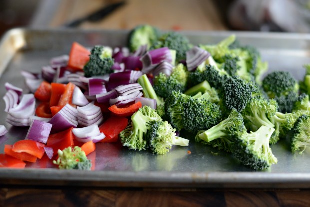 - Toss the broccoli, red pepper and onion on a rimmed, metal baking sheet and set off to the side