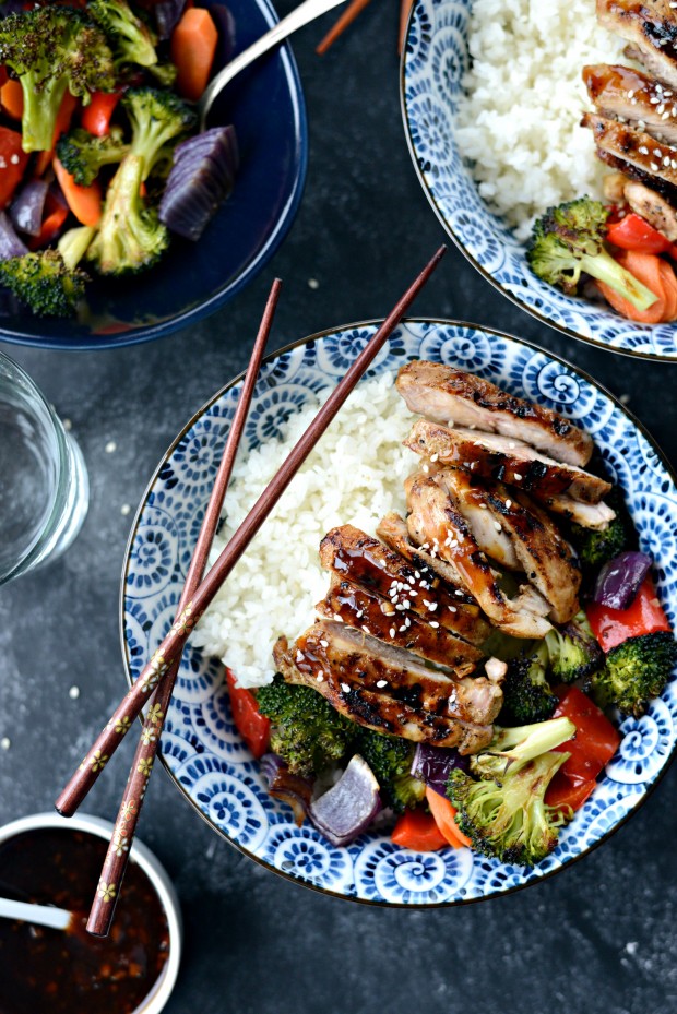 Grilled Teriyaki Chicken Rice Bowls are simple and delicious! Grilled chicken thighs glazed with a sweet homemade teriyaki sauce is served with fluffy cooked rice and a medley of roasted vegetables.