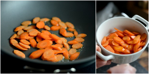 Heat a wok or large chefs pan over medium-high heat. Add a teaspoon of oil and once it’s glistening add in the sliced carrots. Cook until they just start to soften. Remove with a spatula and set off to the side.