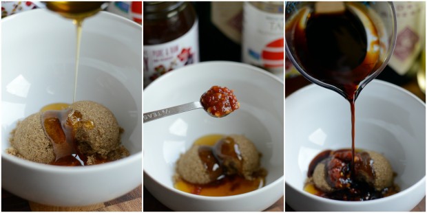 In a medium bowl, combine 2 tablespoons dark brown sugar, 1 tablespoon honey, 1/2 teaspoon chili garlic paste (or sambal oelek), 1/4 cup low-sodium tamari and 3 tablespoons water (or broth can be substituted).