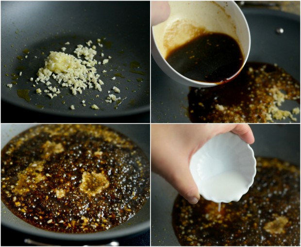 To the remaining oil in the pan, add the garlic and ginger and cook for 30 seconds before pouring in the teriyaki sauce. Bring to a boil and stir in the cornstarch slurry.