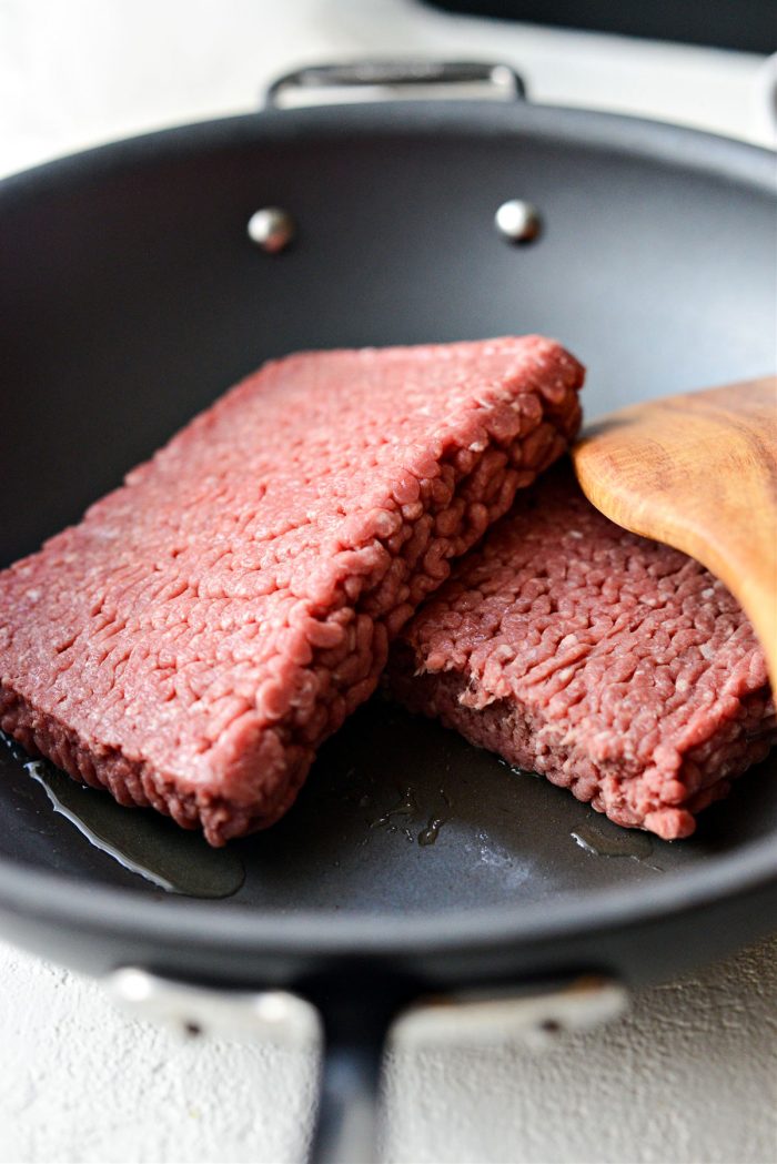- Use a wooden spatula to break up the beef. Cook until no longer pink and the edges of the beef gets browned and caramelized. Once browned, remove and transfer to a clean plate.