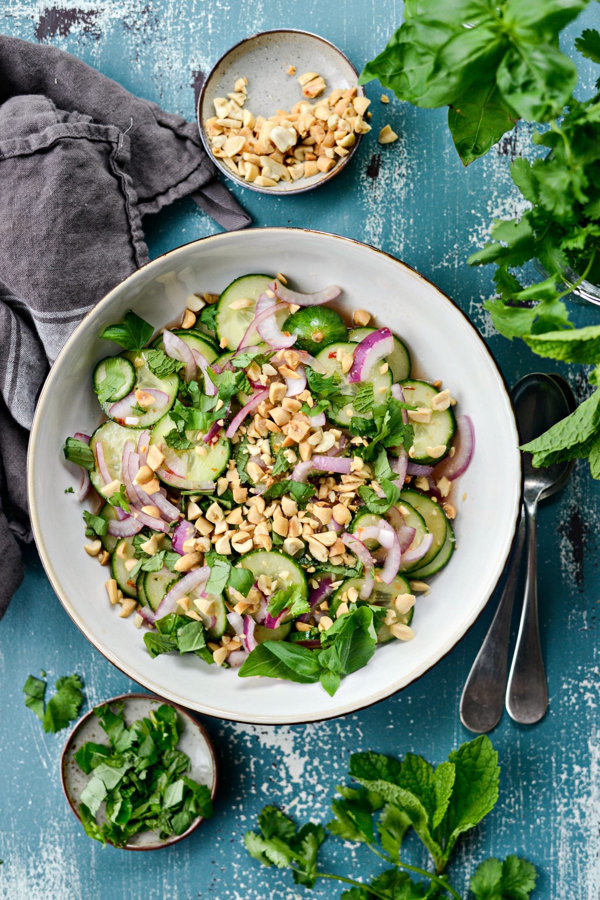 But let’s back up a bit so I can explain this recipe. What you have here is somewhat of a quick pickle situation. Sliced cucumbers and red onion are tossed in a sweet vinegar syrup, the sambal oelek and garnished with three kinds of fresh herbs and chopped roasted peanuts.