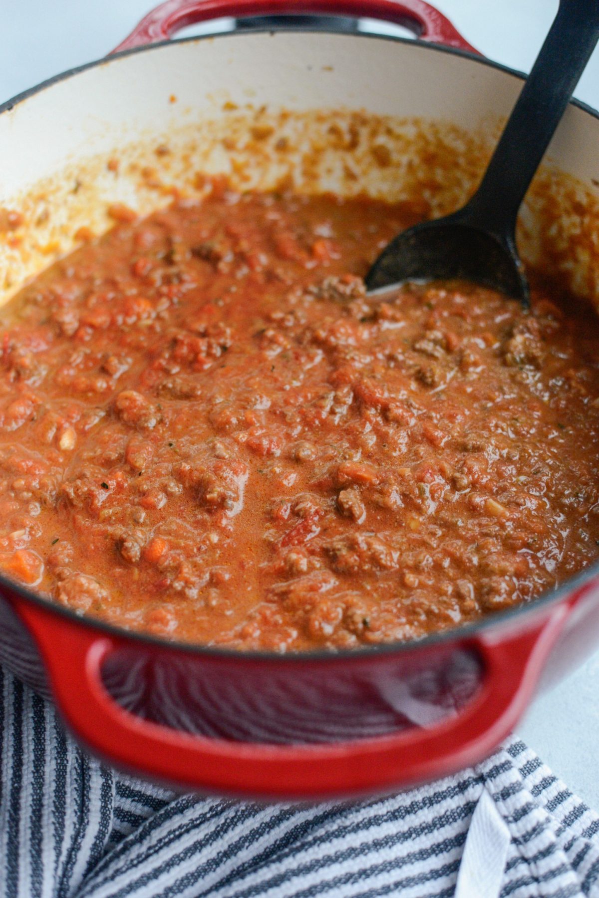 Cover and bring to a boil, then reduce to low and simmer for 1 hour, stirring every 20-25 minutes. Remove the lid and continue to simmer for another 1 hour, still stirring every 2o minutes or until the sauce is thick and rich.
