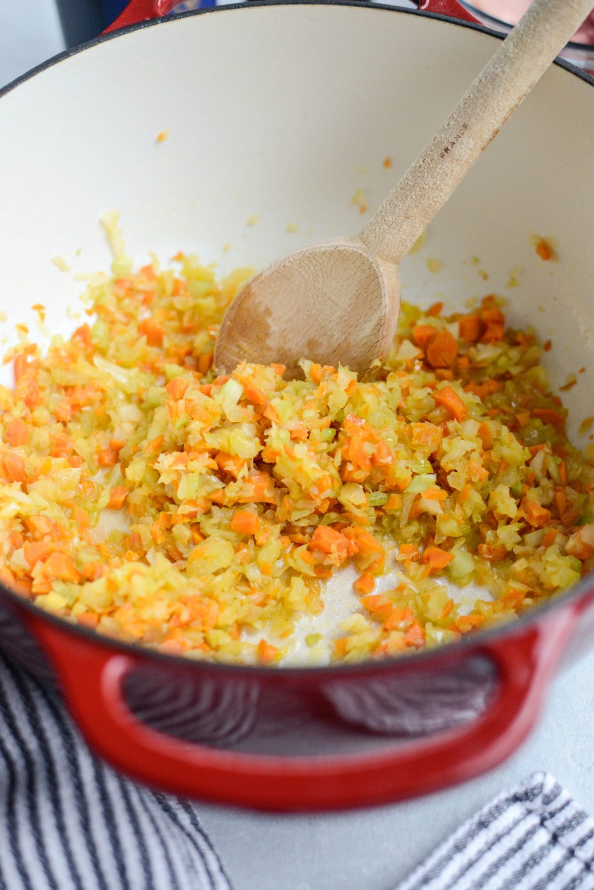 Instead of spending most of my time finely chopping all those vegetables, I gave my onion, celery and carrots a [very] rough chop an threw them into my food processor and pulsed it until finely chopped. This whole step took 5 seconds.