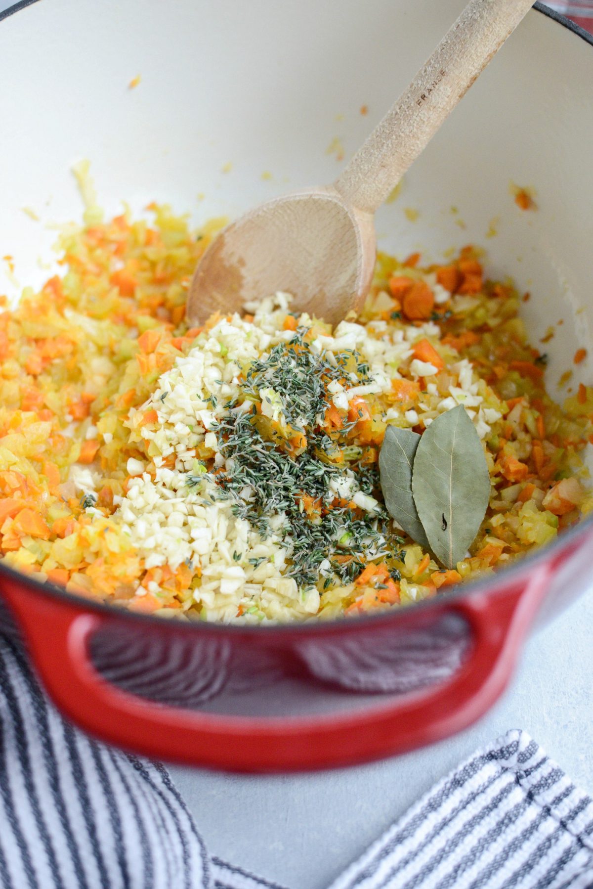 Once the vegetables are tender, add in the garlic, thyme and bay leaves. Stir and cook for 2 minutes.