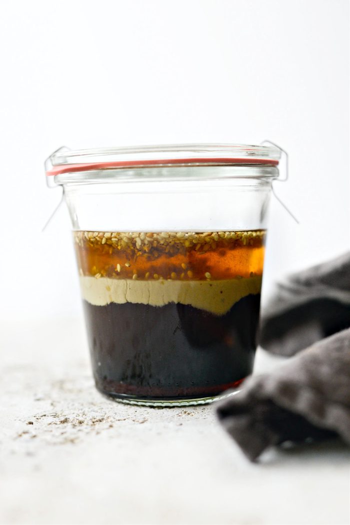 In a glass jar or container with a tight-fitting lid, measure and add 3 tablespoons rice vinegar, 2 tablespoon toasted sesame oil, 2 tablespoon olive oil, 2 tablespoons coconut aminos, 1 maple syrup, 1 tablespoon each grated fresh ginger and garlic and 1 tablespoon tahini.