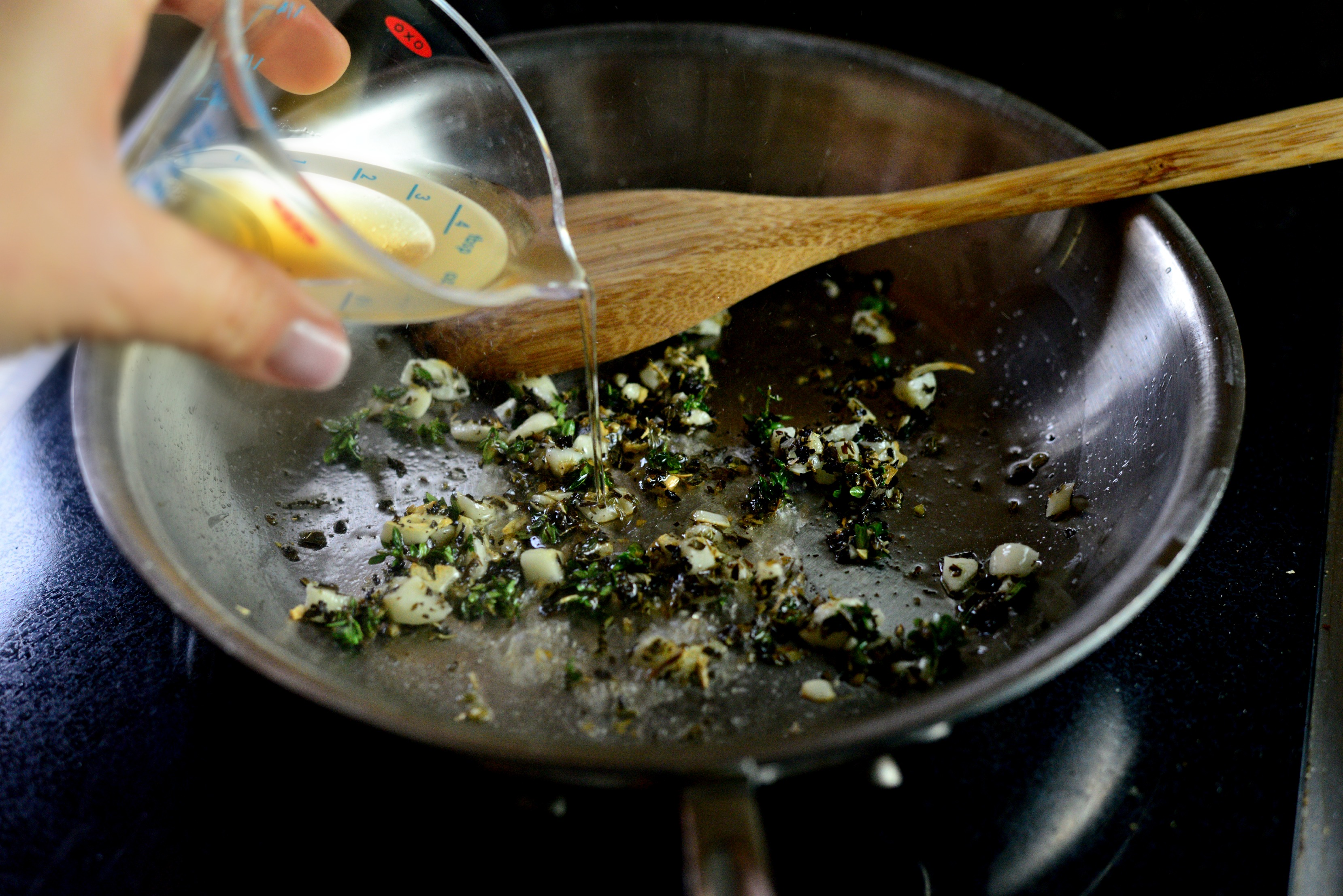- Meanwhile, add 1 teaspoon of oil to a small skillet and heat over medium-low. Add garlic and herbs, cooking for 1-2 minutes. Pour in 1 tablespoon Sherry wine and cook until reduced by 90%. Remove the skillet off of the heat and set to the side.