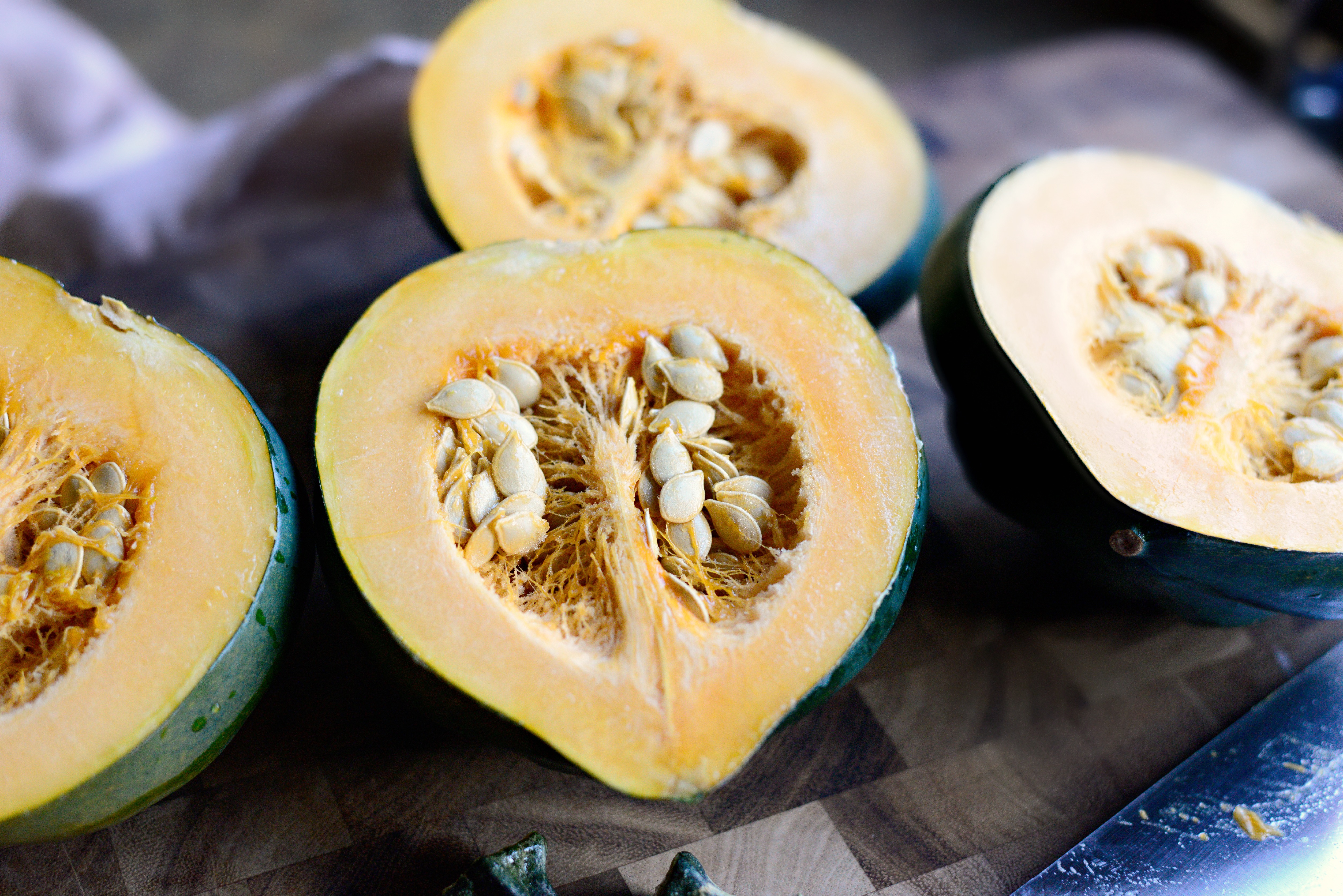 With a sharp chefs knife, halve 2 small acorn squash from root to tip.