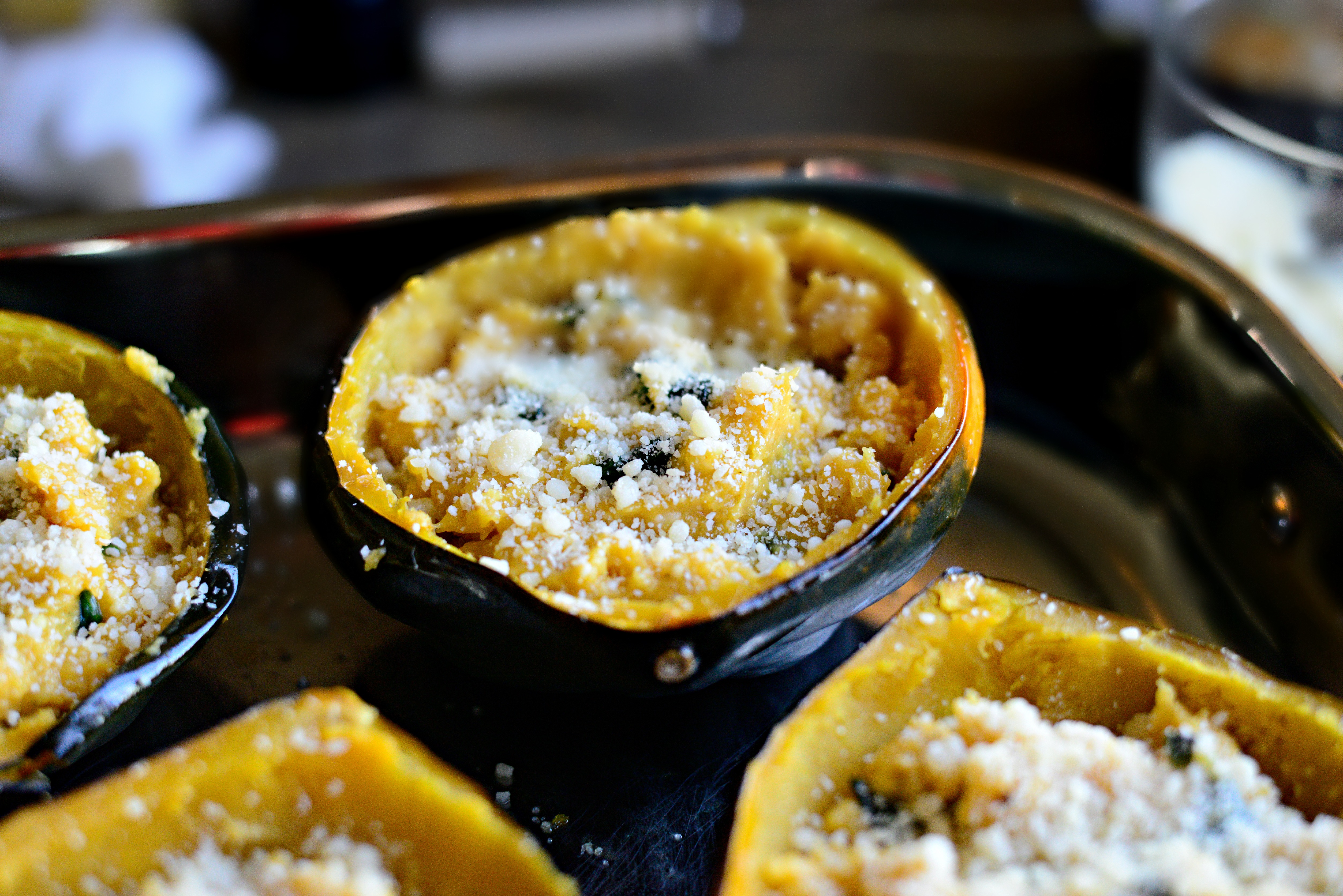 - Scrape the flesh of the squash into a large bowl. Add the butter and heavy cream and mash until smooth. Use a spatula to stir in 1/4 cup of the Parmesan, salt, pepper, paprika and cooked spinach. Divide and fill each squash with the filling and sprinkle with remaining cheese.