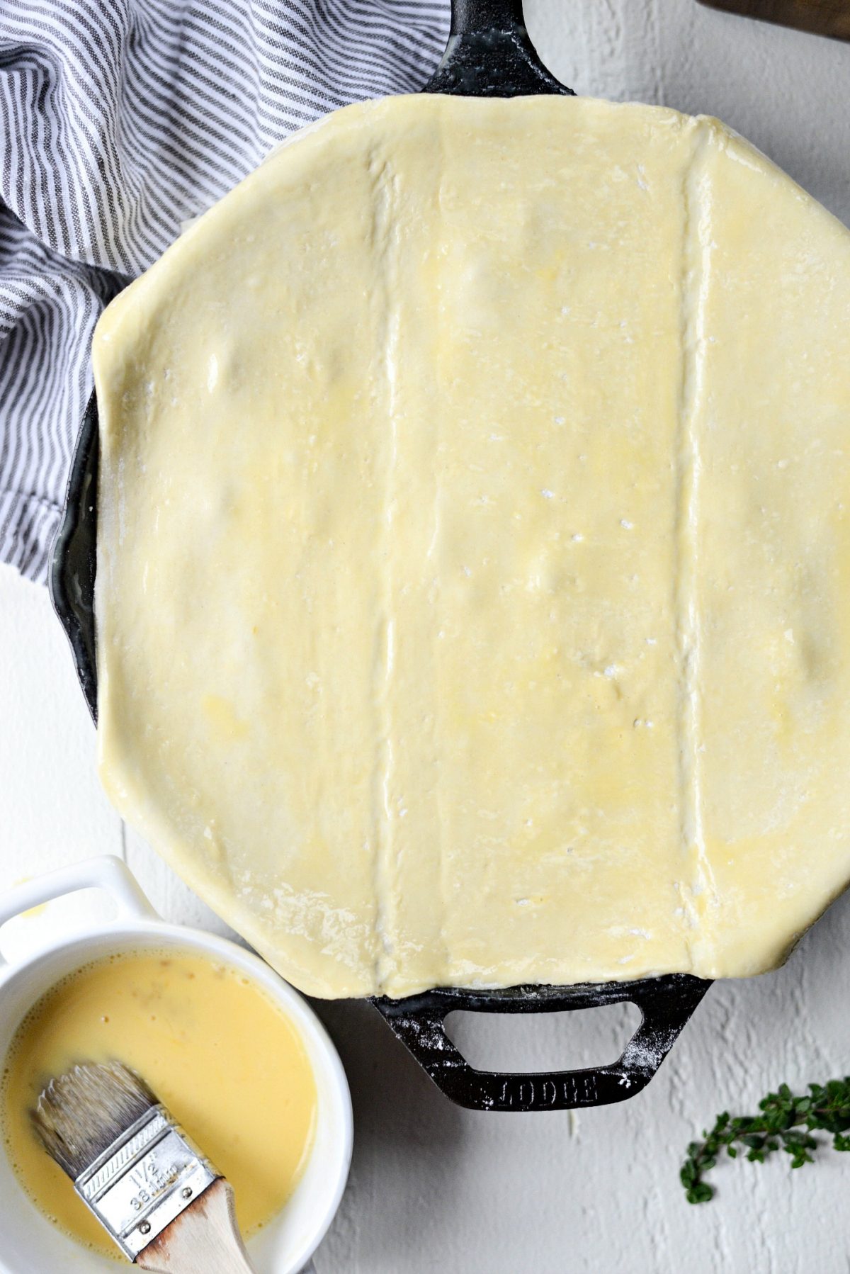 Quickly brush the top of the pastry with egg wash before placing the skillet onto a rimmed sheet pan and sliding into your preheated oven.