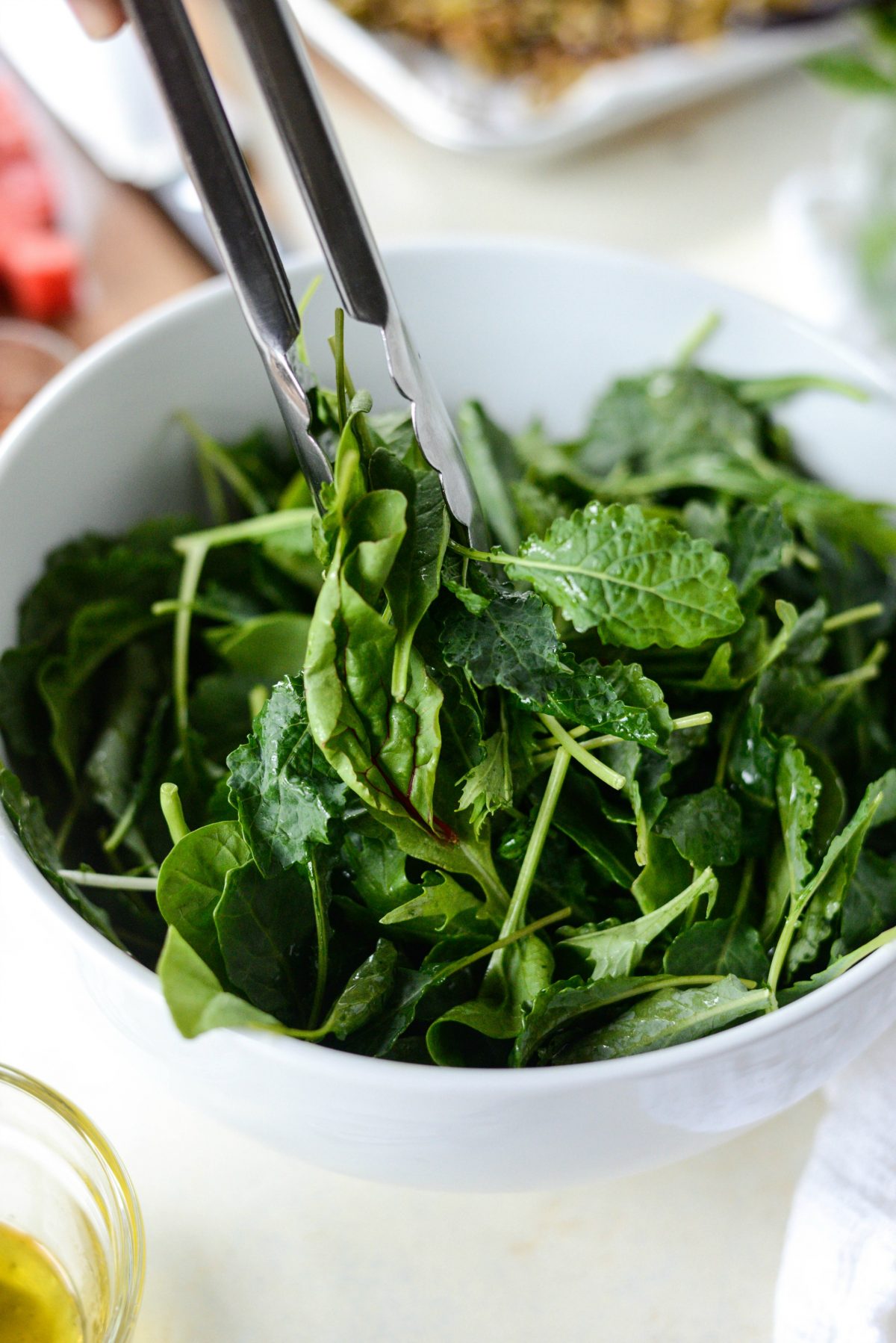 Baby spinach, arugula, spring mix or a power mix of baby spinach, kale, mizuna, chard and kale. Really it doesn’t particularly matter.