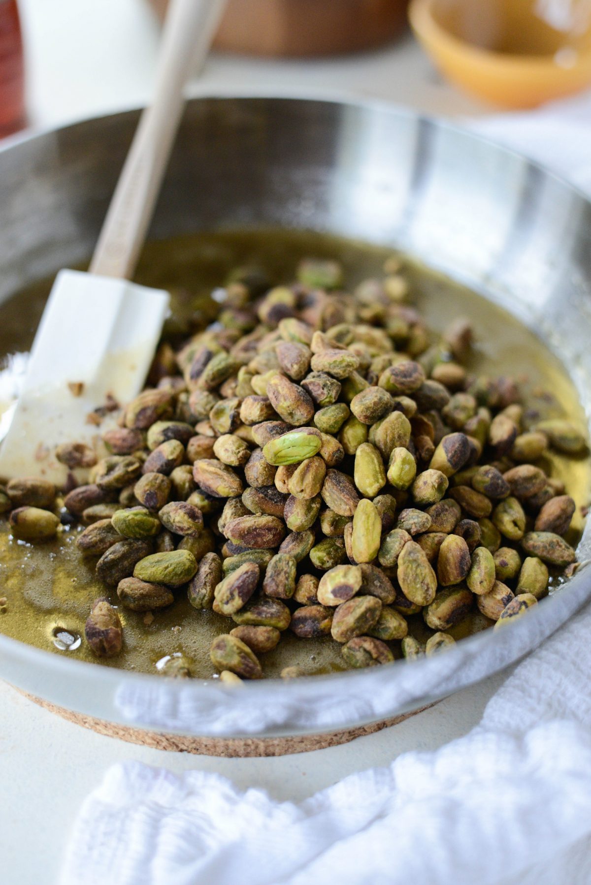 Turn the heat up to medium-high. Stir continuously until the pistachios are completely coated and the pistachios start to toast and are fragrant. About 1 to 2 minutes.