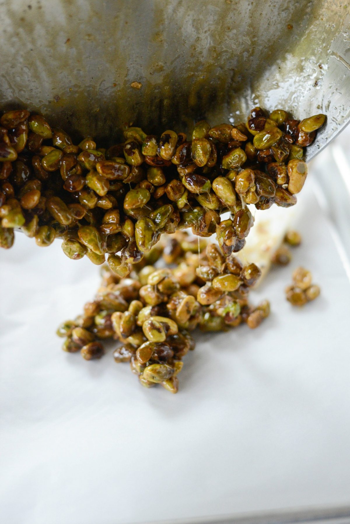 - Transfer the hot and sticky pistachios to parchment paper or a silicone baking mat to cool. They will harden as they cool.