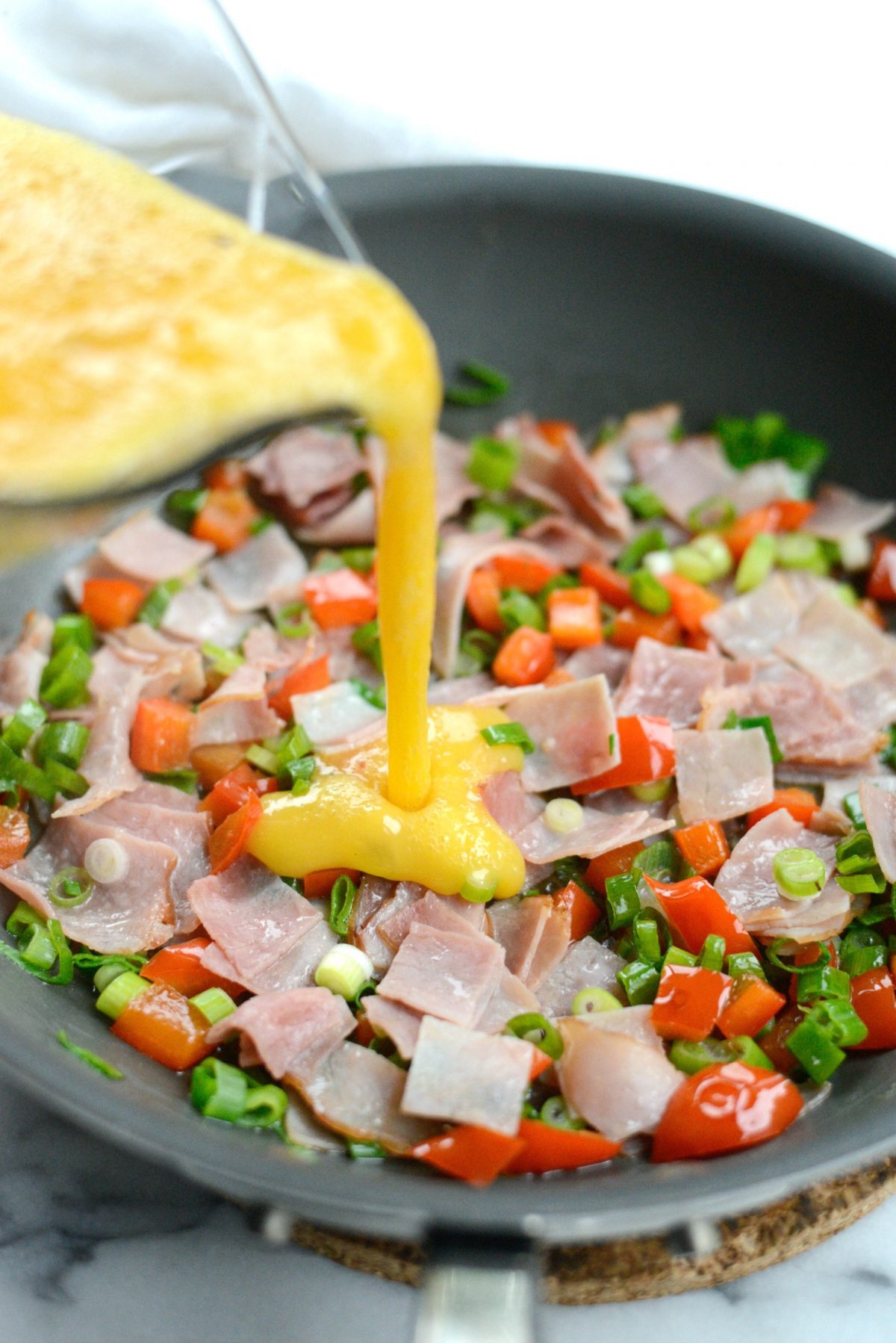 Prepping the ingredients shouldn’t take you forever; dice up the ham, peppers — I like to use red because they’re sweeter and add a pop of color– then slice the green onions then shred the Swiss.