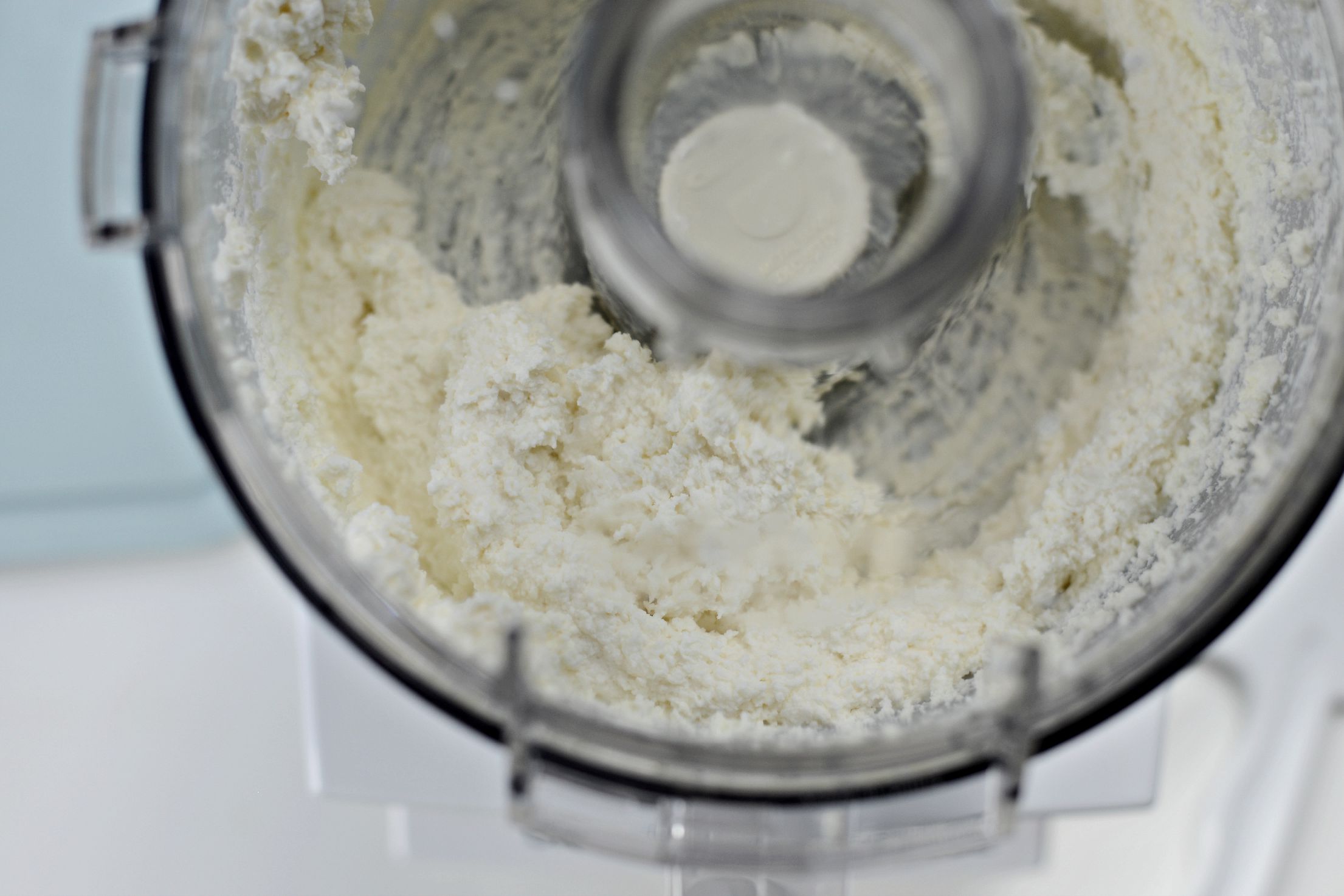 - In the bowl of your food processor, fitted with the blade attachment, add feta and whipped cream cheese. Process until smooth, stopping halfway to scrape down the sides.