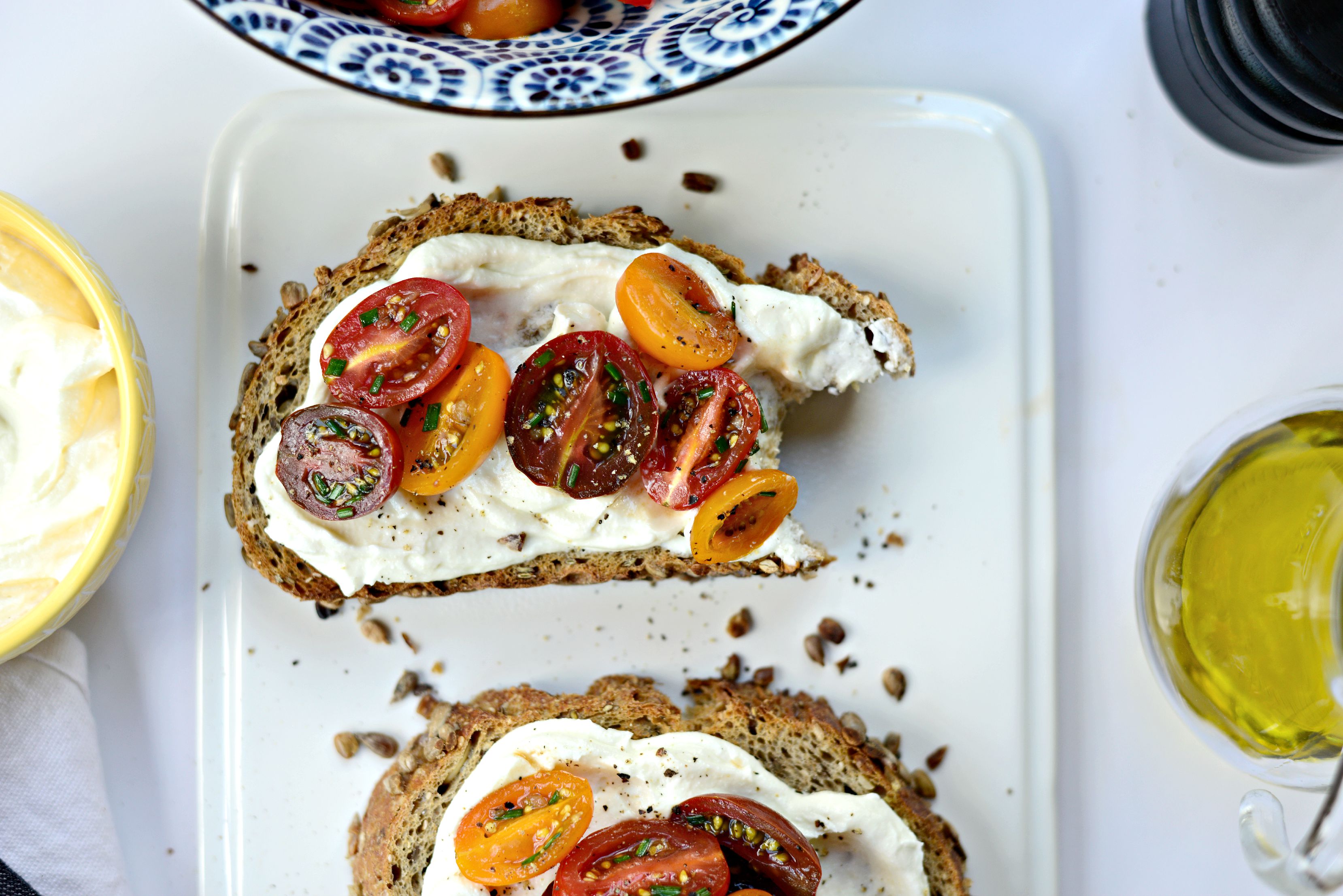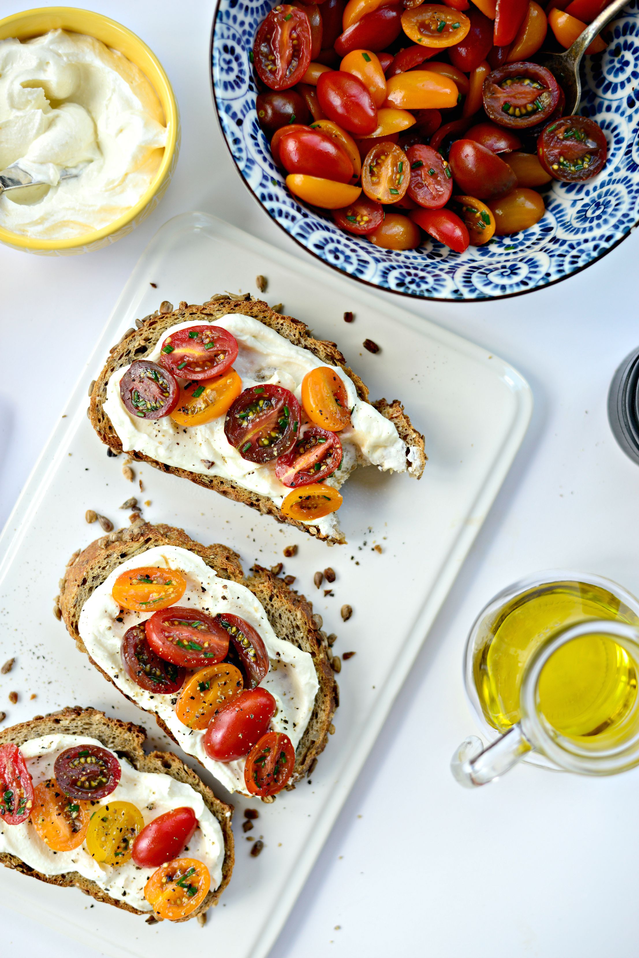 Toast slathered with a creamy, dreamy whipped feta and topped with marinated tomatoes. For a healthy and flavorful snack you’ll just love!