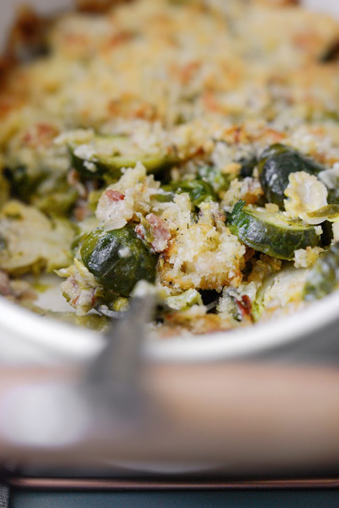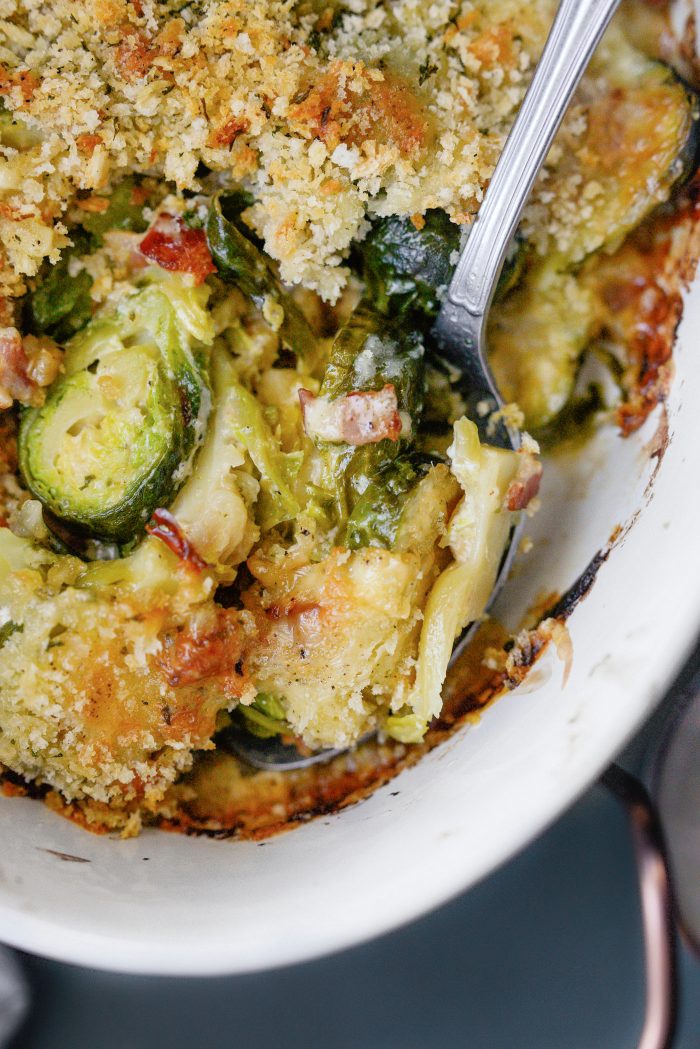 A creamy, cheesy, bacon-y, brussels sprout gratin complete with a crispy buttery breadcrumb topping.