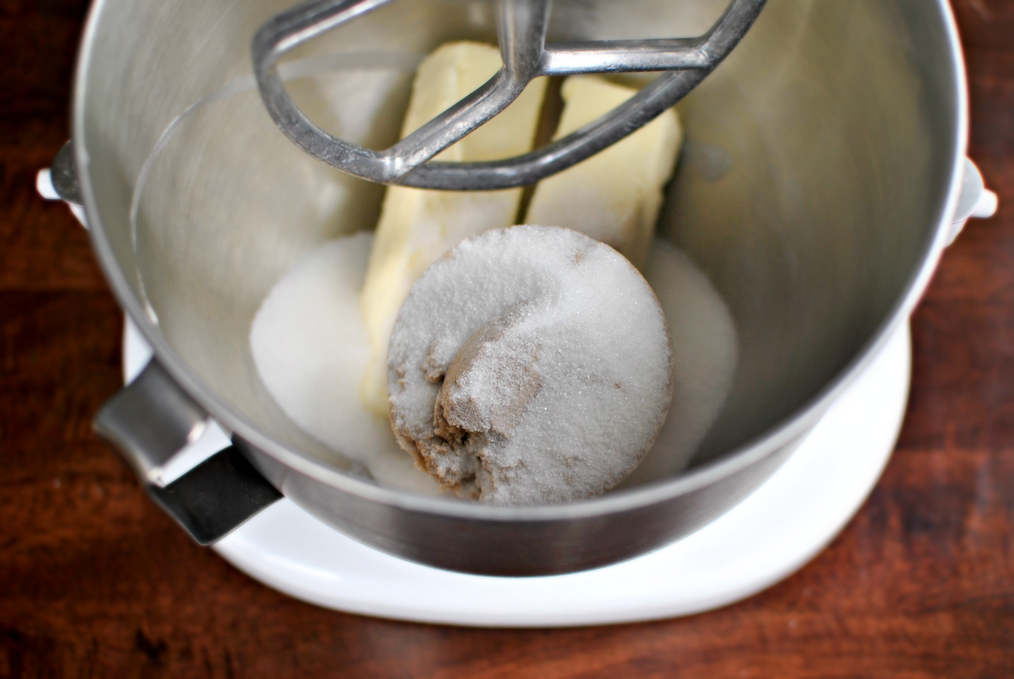 - In the bowl of your mixer add the two sticks of butter along with the light brown and granulated sugars. Blend at medium speed until combined.