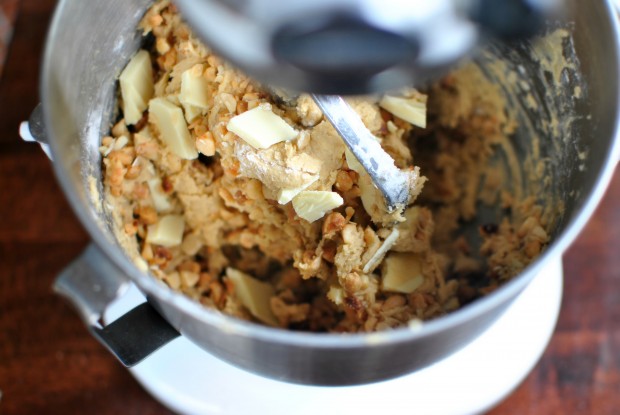 - Lastly add in the roasted macadamia nut pieces and the chopped white chocolate. Mix on low until they are evenly throughout the cookie dough. Be careful not to over-mix.