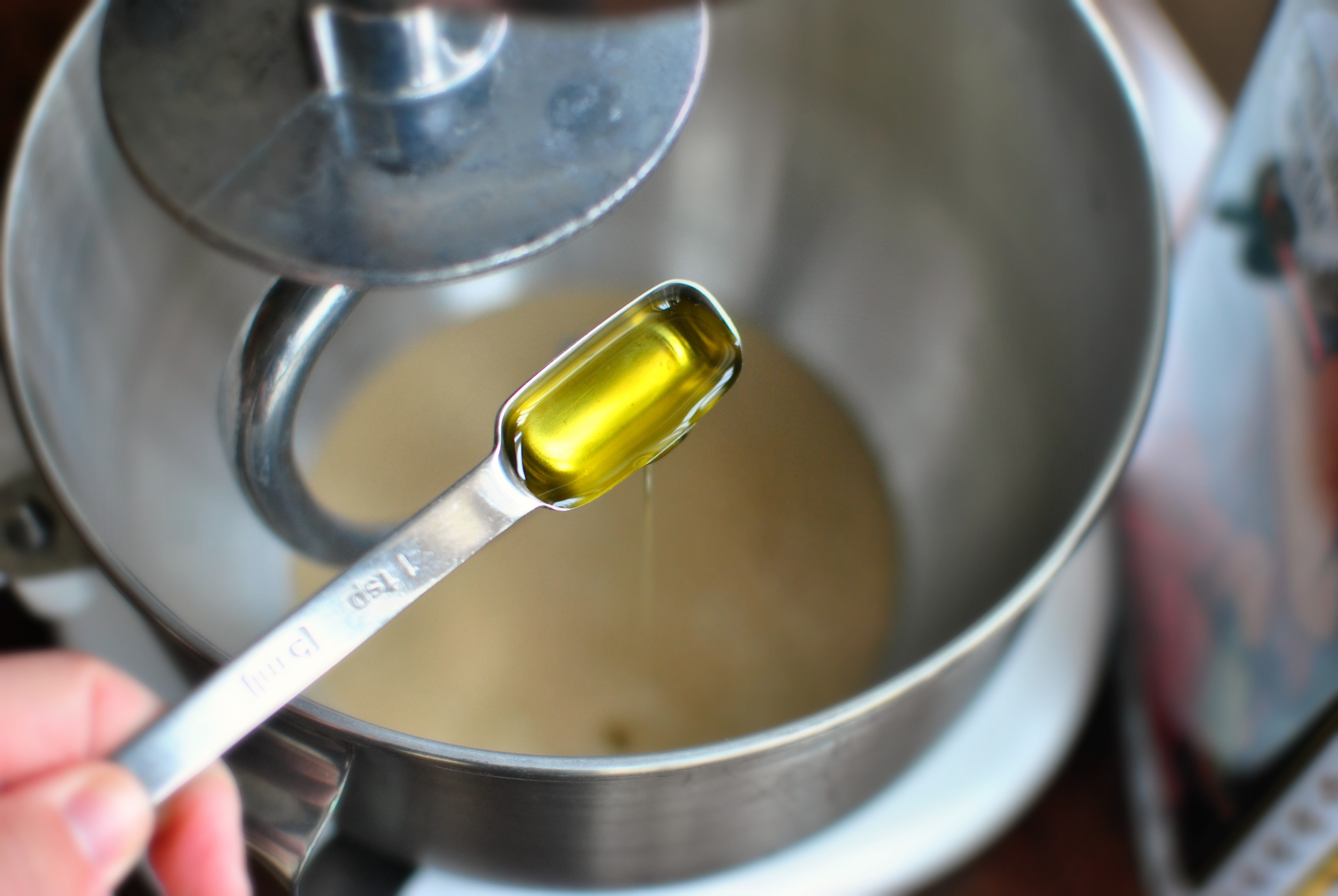 - Add in the olive oil and turn your mixer on low. Gradually add in the flours, increasing the speed as you go.