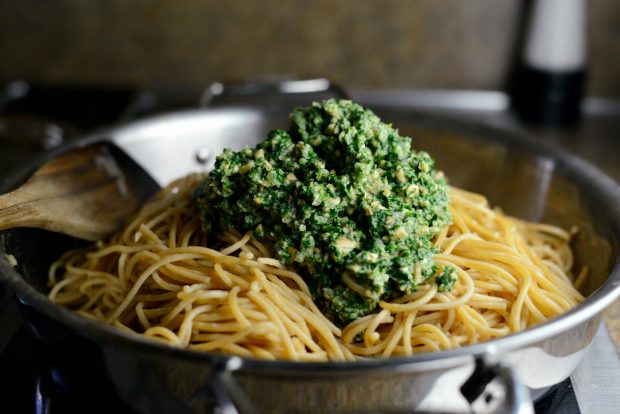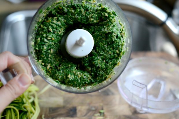 - Transfer the spinach mixture to the mini food processor (with the almonds) and process until it resembles pesto.